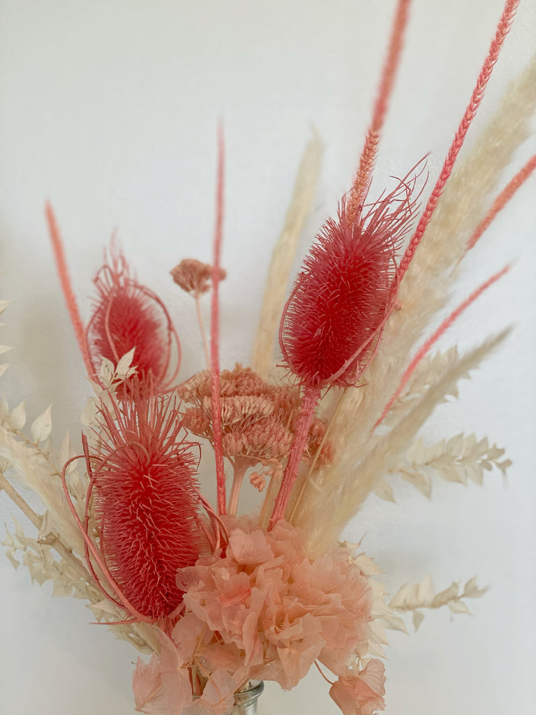 Pink Lemonade is summery, fun and bright! ! It’s designed in a glass bottle vase and includes dried/preserved florals such as bright pink teasels (aka thistle), pink hydrangea, yarrow, pampas, blade grass and ruscus.