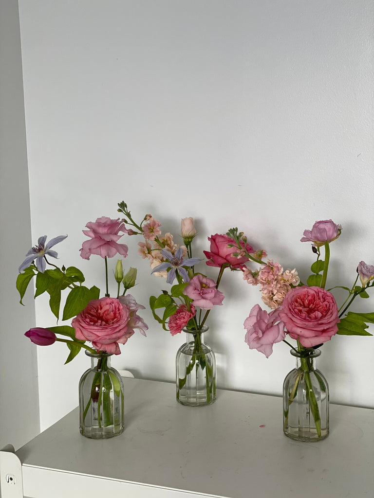 This set comes with three clear glass bud vases. Perfect to use as a centrepiece tablescape or sprinkle around your home/venue to add a bit of colour. Each bud vase has 4-5 seasonal fresh flowers.