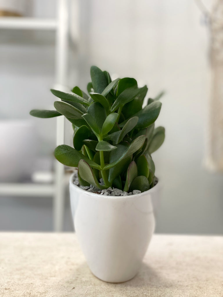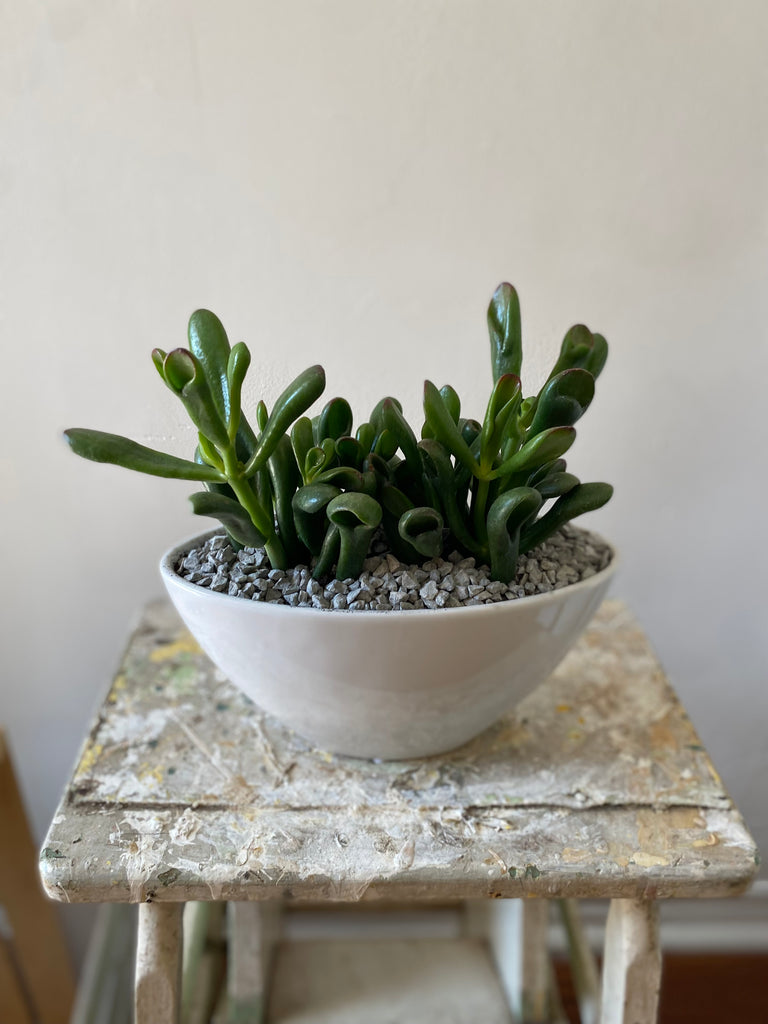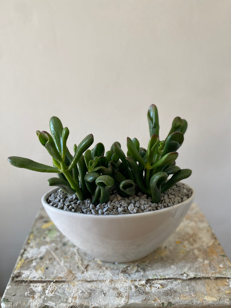 Beautiful and modern arrangement of jade planted in a low oval vessel. Perfect shape for a table centrepiece, coffee table, window ledge or shelf. Easy, low maintenance plant. Allow soil to completely dry out between waterings.