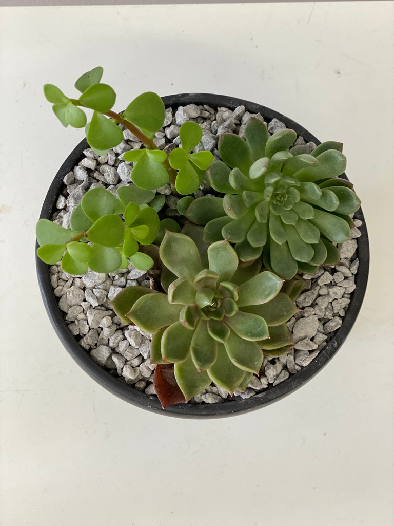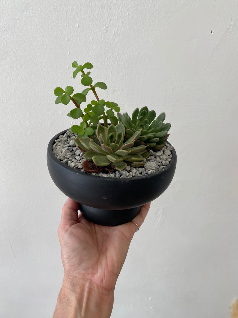 Footed ceramic bowl planted with small, locally grown succulents and topped off with gravel and moss accents. Makes a lovely gift for a birthday, thank you or just because. Suited best for a small tabletop, counter, window ledge or shelf.